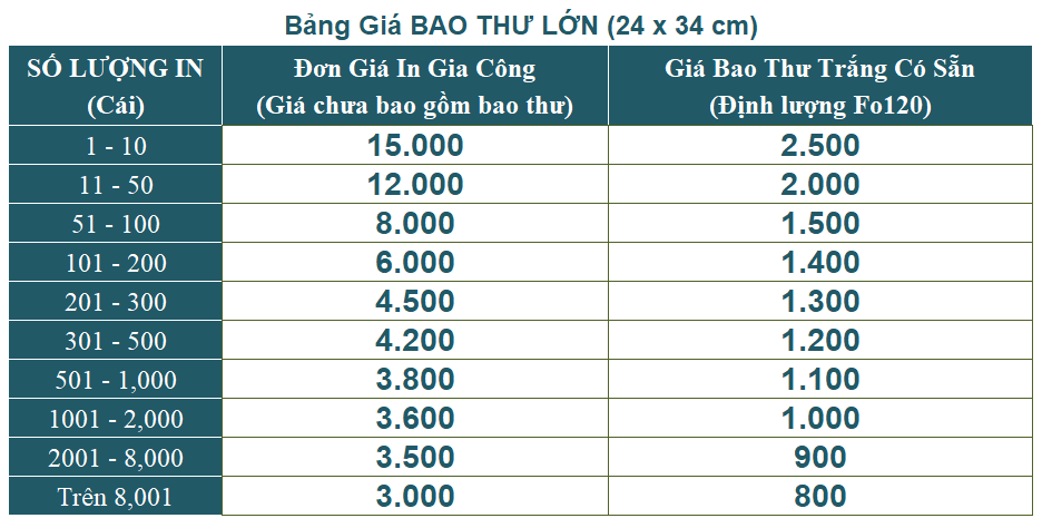 Qui cách: In 4 màu ( ko in nắp hay in nền sát viền bì thư )