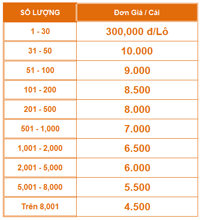 Bảng giá trên chưa bao gồm chi phí thiết kế 50,000Đ – 100.000Đ